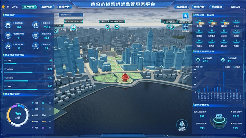 贯彻落实城市基础设施生命线安全工程与韧性城市的建设要求,在青岛市中心城区25座桥梁规模化部署智能感知设备,构建覆盖全面、实时在线、智能预警的桥隧健康监测体系,实现对中心城区桥梁安全风险的全方位监测与预警,及时消除风险隐患,保障桥梁安全运行,提升城市防灾减灾能力,同步开展BIM建模和数字孪生技术应用,推动桥隧管养模式向数智化转型。相关经验被列为山东省城市市政公用领域典型经验在全省推广;作为典型案例相关内容在住建部《中国建设报》刊发报道。