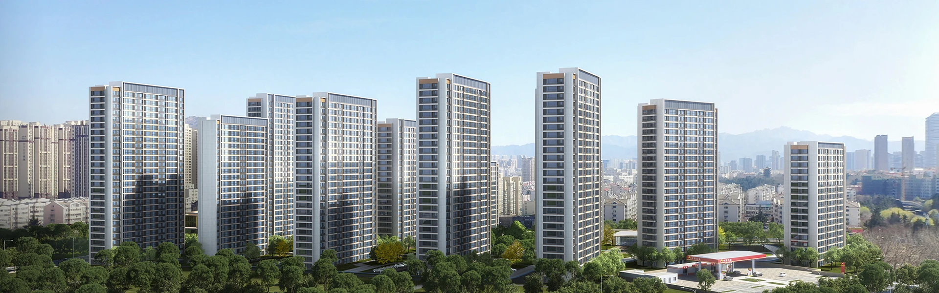 京口路保障性住房项目位于青岛李沧区京口路以北,虎山路以南,顺河支路以西,南侧紧邻大村河景观带。对外交通便利,教育、医疗、商业等生活配套便捷。总用地面积约6.18万㎡,容积率2.7,绿地率30%。项目规划16栋11F-27F高层住宅和2栋公服配套用房。总建筑面积约23.03万㎡,其中地上计容建筑面积约16.68万㎡,地上不计容建筑面积约0.39万㎡,地下建筑面积约5.96万㎡,共计1801户。